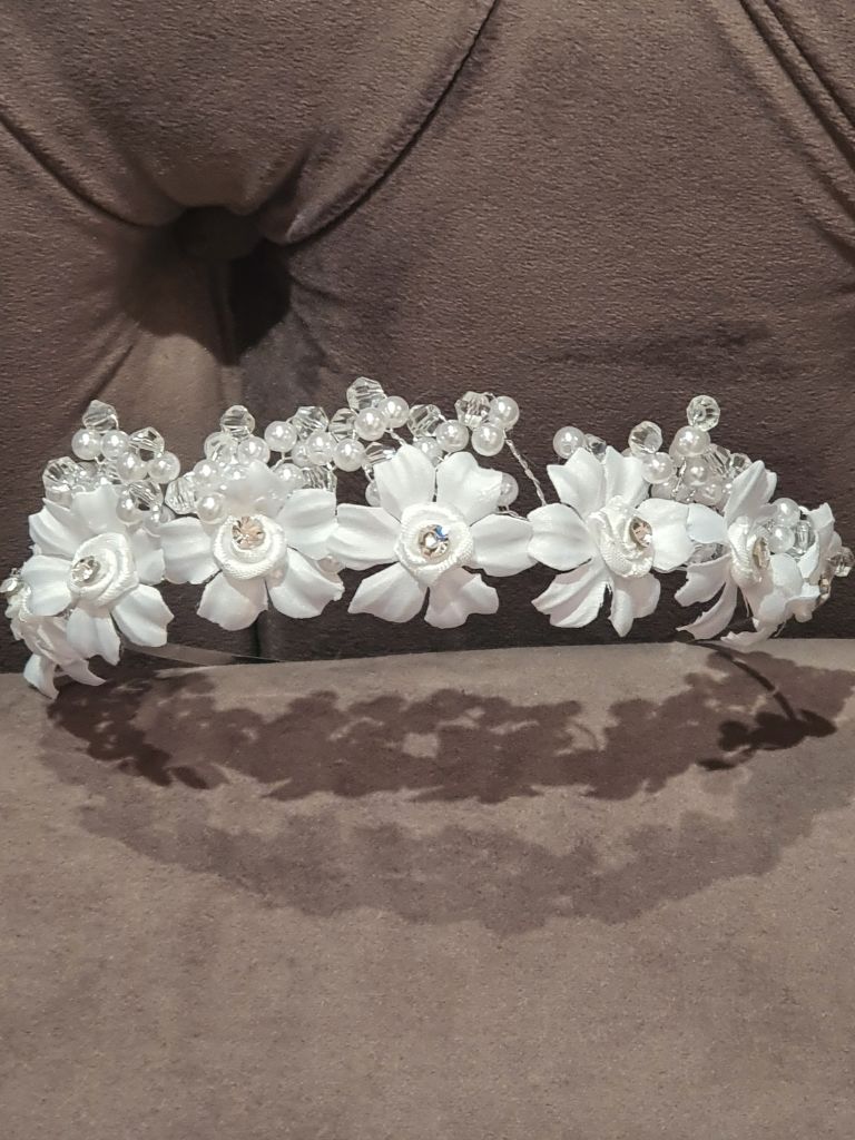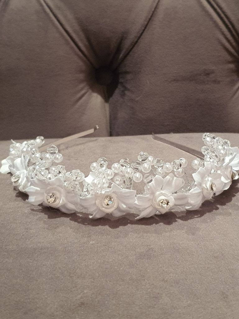 This elegant girl's Communion headpiece is a timeless choice for First Holy Communion day. Designed as a delicate floral headband, it features beautifully crafted white fabric flowers, each finished with a sparkling crystal centre. The design is enhanced with pearl and crystal bead detailing, creating a soft shimmer that catches the light without overpowering the look.