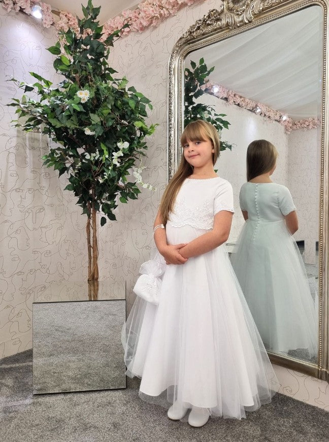 Pair it with matching gloves, a veil or a floral headband for a complete Communion day look.