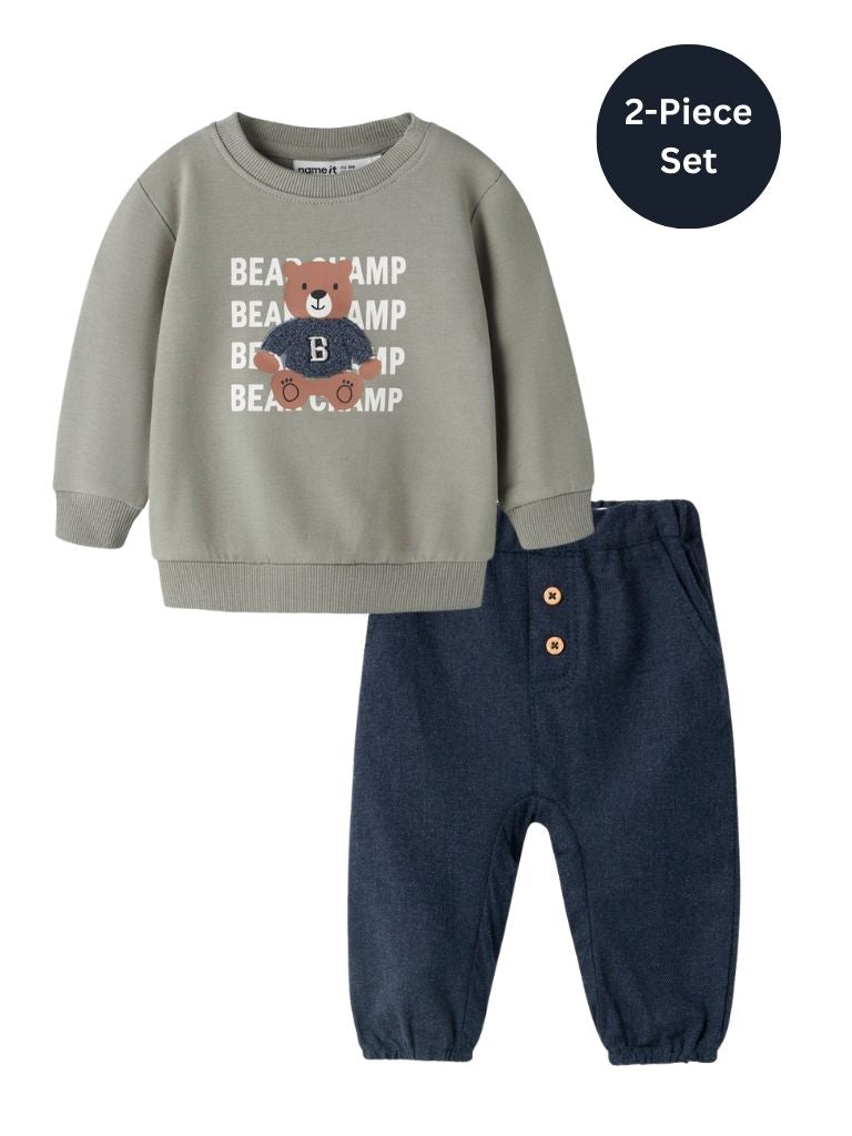 Keep your little champion cosy and stylish with this delightful 2-piece ensemble. The soft sweatshirt features an endearing teddy bear design, paired with textured navy trousers that add an earthy, comfortable vibe. Whether you're heading out on a chilly day or settling in for relaxed playtime, this set delivers warmth and charm in one adorable package. Your baby will look absolutely precious while staying snug and content.
