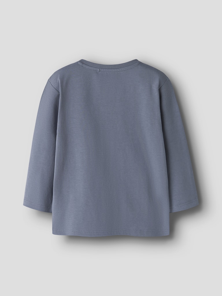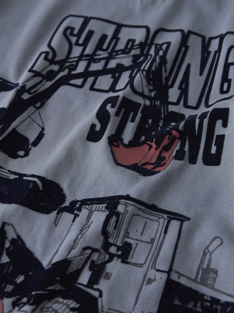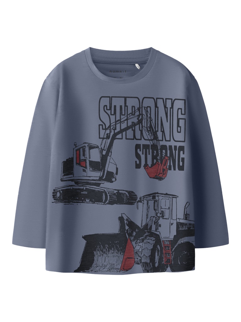 - Blue long-sleeve top with fun digger and bulldozer velvet graphics and “STRONG” print across the chest
