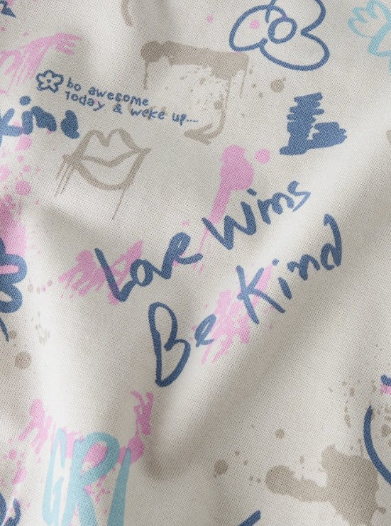 - Fun, colourful all-over print with uplifting messages like "Girl Power" and "Have a Nice Day"