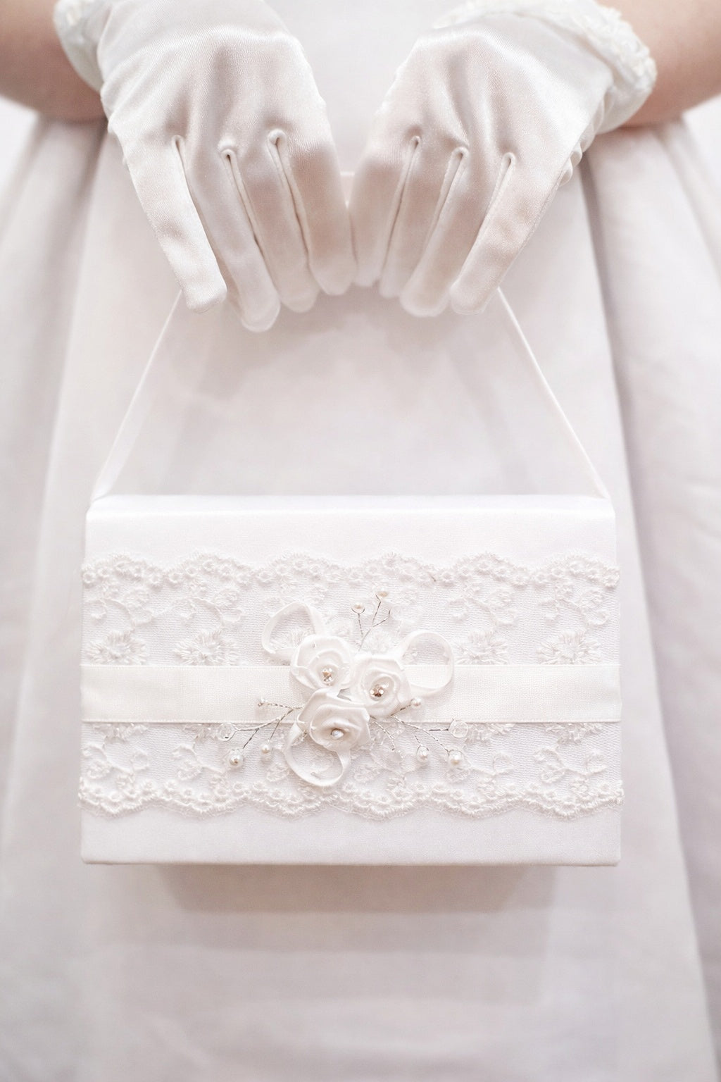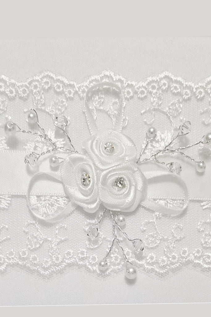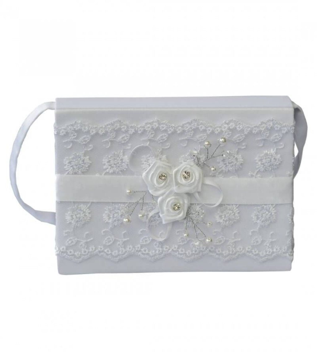 This beautiful structured First Holy Communion bag will match perfectly with her white Communion dress. The lace design and satin roses with the diamante centre are embellished with silver stems and pearls. This classic shape incorporates a snap button closing and a short strap. A pretty and sophisticated choice for any Communion girl.