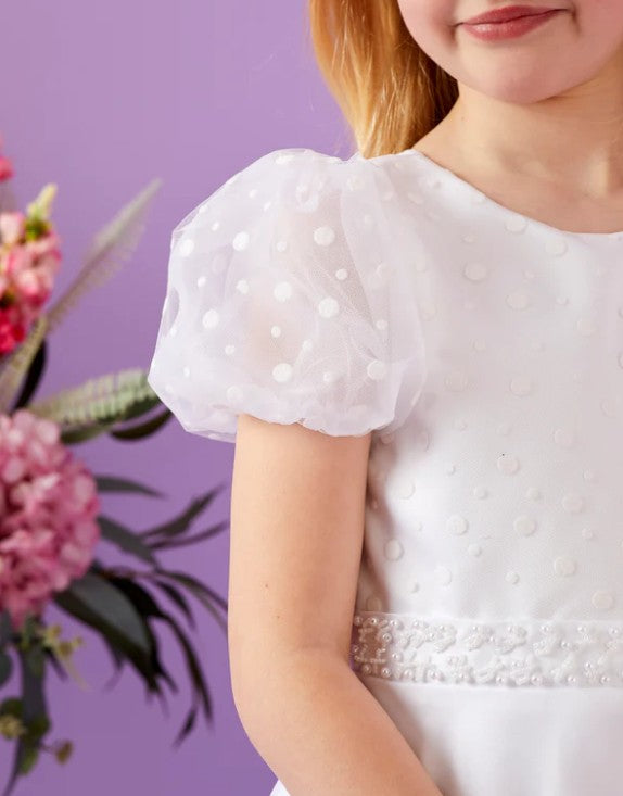 The Iva Communion Dress is a show-stopping ankle-length gown, designed to make her feel truly special on her First Holy Communion day. Crafted with stunning attention to detail, the bodice and sheer sleeves are made from delicate flock spot organza, finished with a beautiful pearl-beaded waistband for a touch of subtle sparkle.