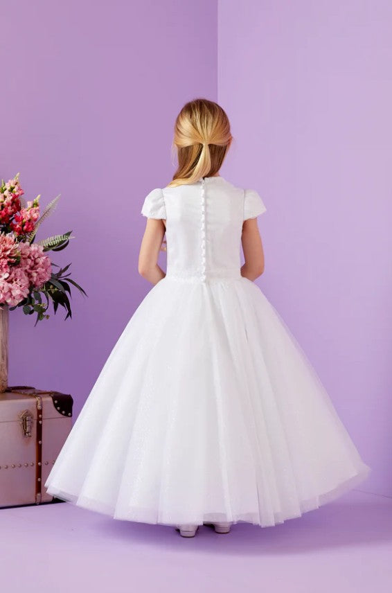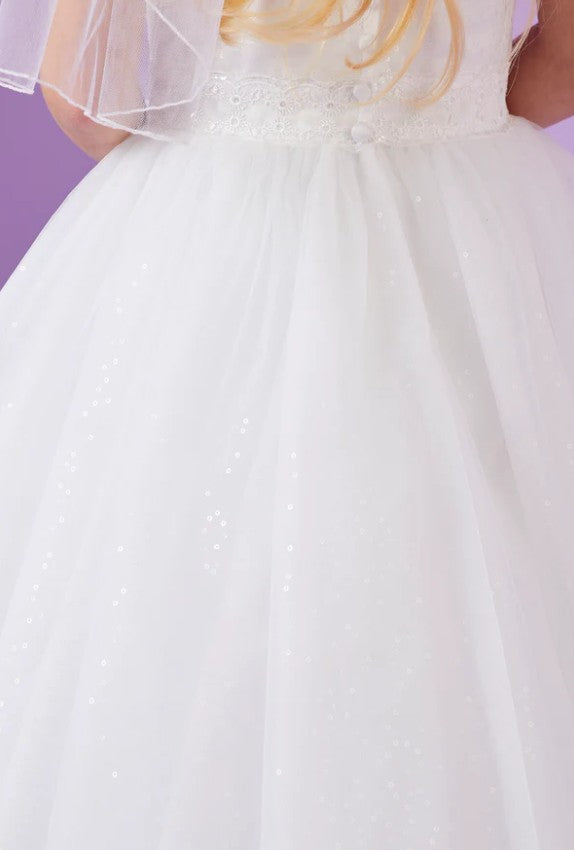 The Maggie dress is a stunning option for parents looking for a First Holy Communion dress that blends sophistication with playful sparkle, while offering a fuss-free fit that little girls will love.