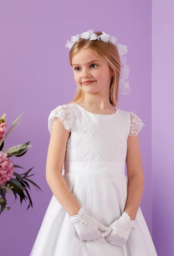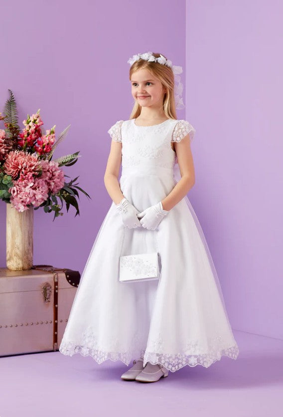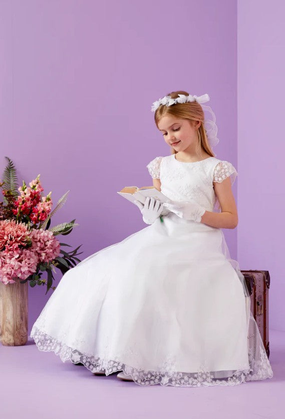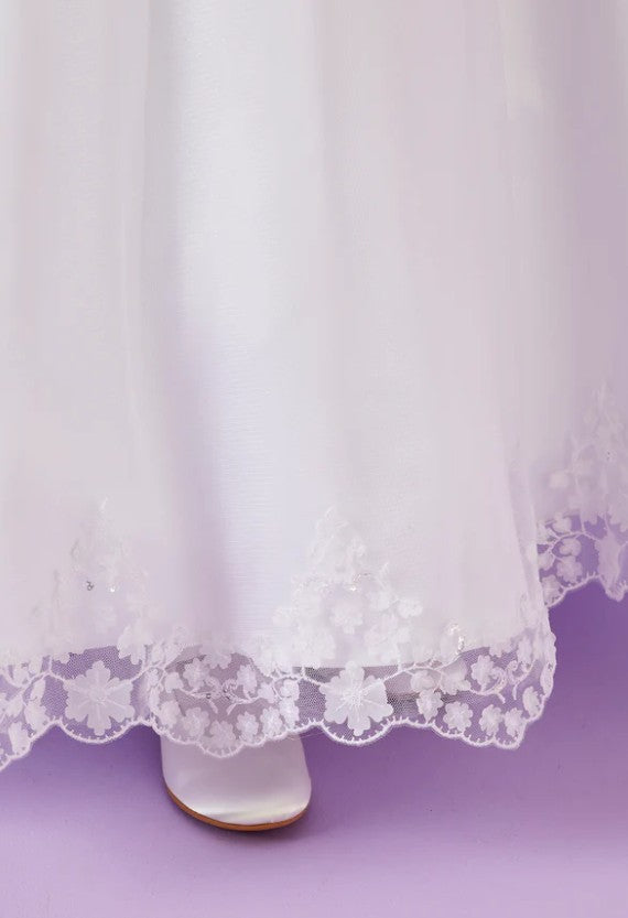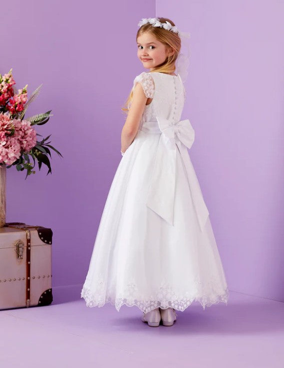 The Summer Communion Dress by Peridot is a graceful ankle-length gown that combines classic elegance with delicate detailing. Featuring a beautifully embroidered lace bodice and soft gathered lace cap sleeves, this dress offers a timeless look perfect for her special day.