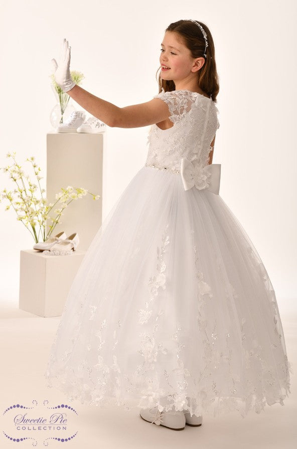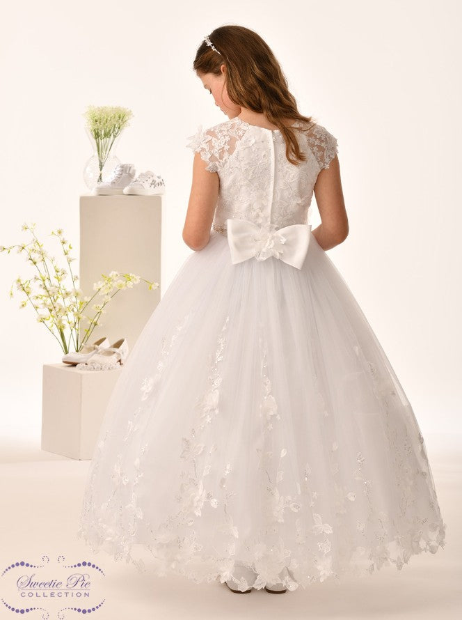 Make her First Holy Communion unforgettable with the Sweetie Pie SW5032 dress, a beautiful blend of timeless elegance and delicate charm. With soft floral appliqué and a full princess-style skirt, this girl's Communion dress is designed to make her feel like the centre of attention from the church aisle to the celebration.