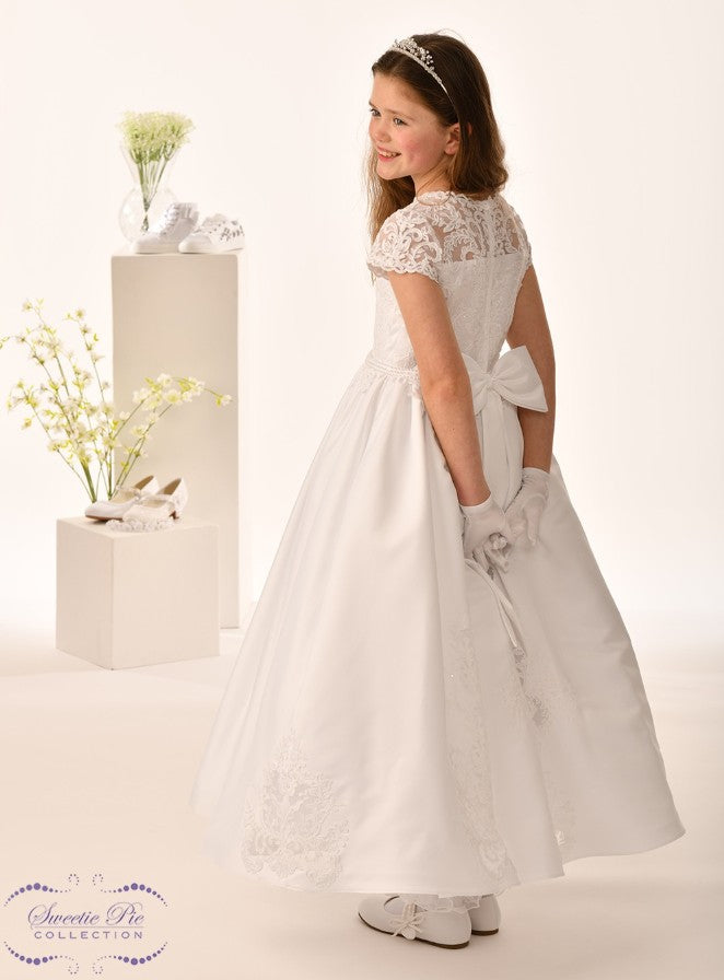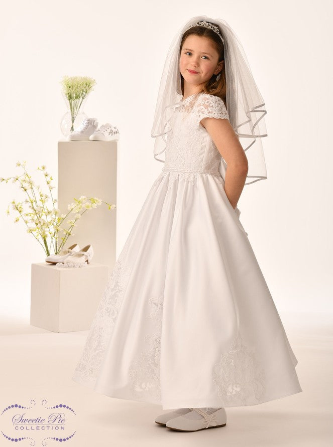 - Classic Communion dress style with modest short sleeves and a full-length A-line skirt for a traditional silhouette