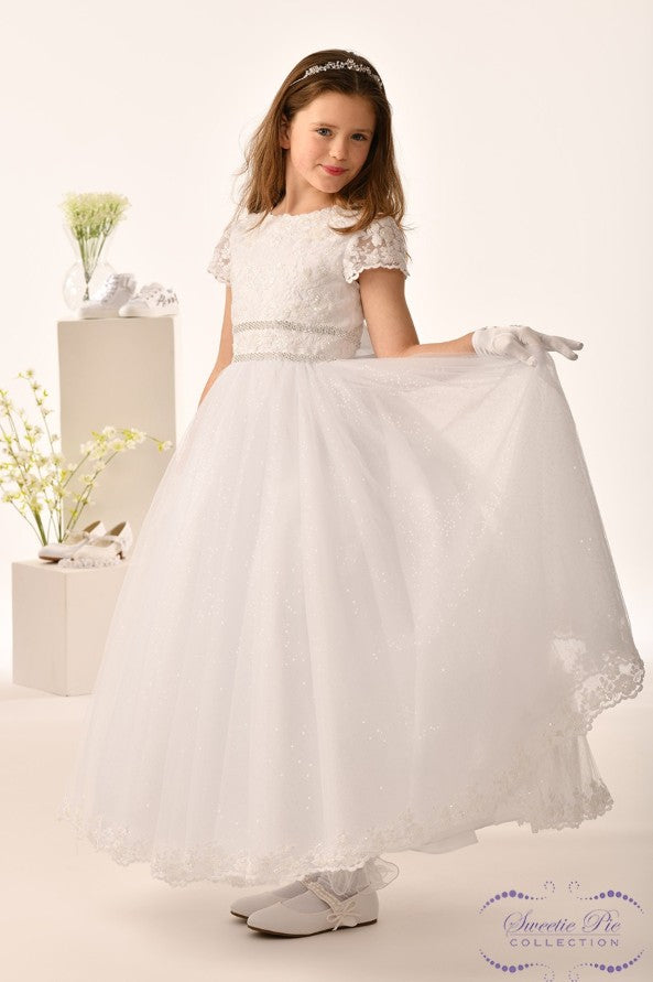 - Classic First Holy Communion dress, a full-length, traditional silhouette with a modern sparkle