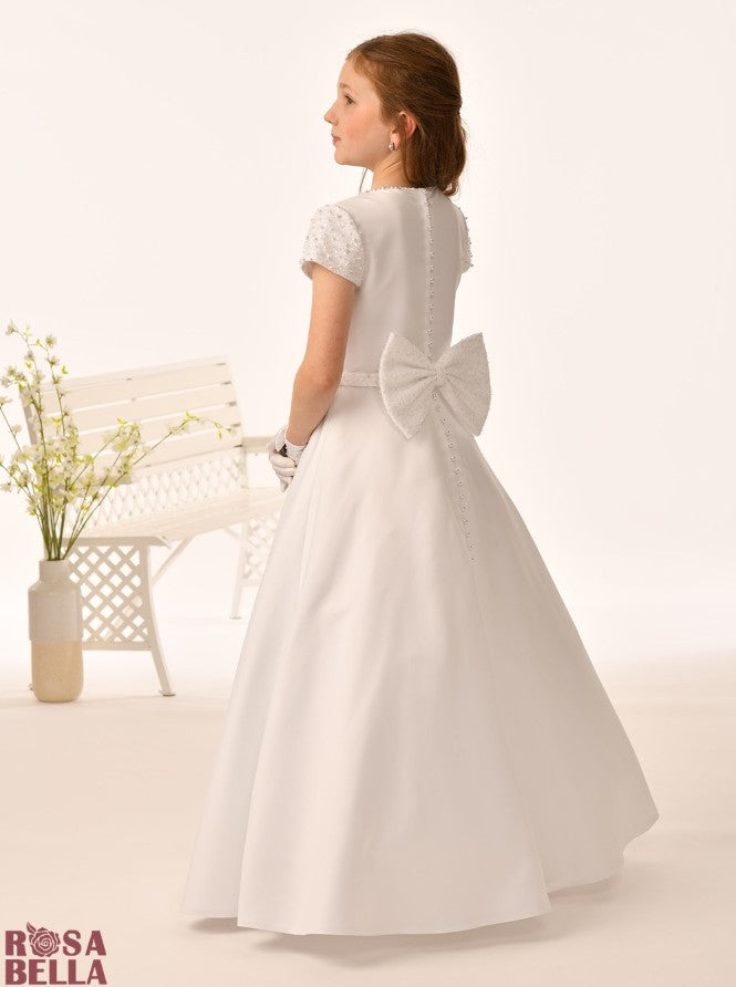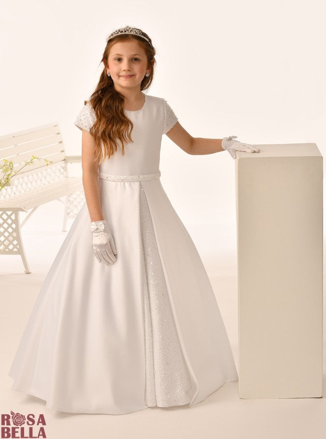 Celebrate your daughter's special milestone in the Rosa Bella RB675, a First Holy Communion dress that strikes the perfect balance between classic grace and modern flair. Featuring a flattering silhouette with just the right amount of subtle shimmer, this dress lets her shine without stealing the show. Designed for comfort and confidence, it's the kind of timeless piece that photographs beautifully and becomes a cherished memory of her big day. Pure elegance with a touch of magic.