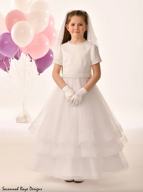 Absolutely perfect for her First Holy Communion day, the Bella dress by Linzi Jay is a stunning blend of simplicity and elegance. Designed for girls who want to feel both princess-like and comfortable, this dress brings classic charm with a modern twist. With its tiered tulle skirt and delicate pearl detailing, Bella offers a graceful silhouette and a magical twirl factor that little ones will adore.