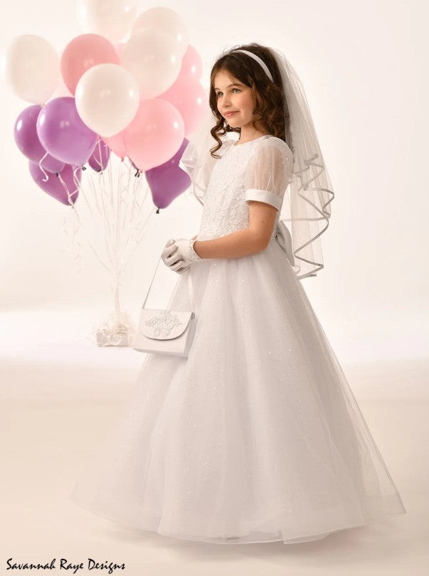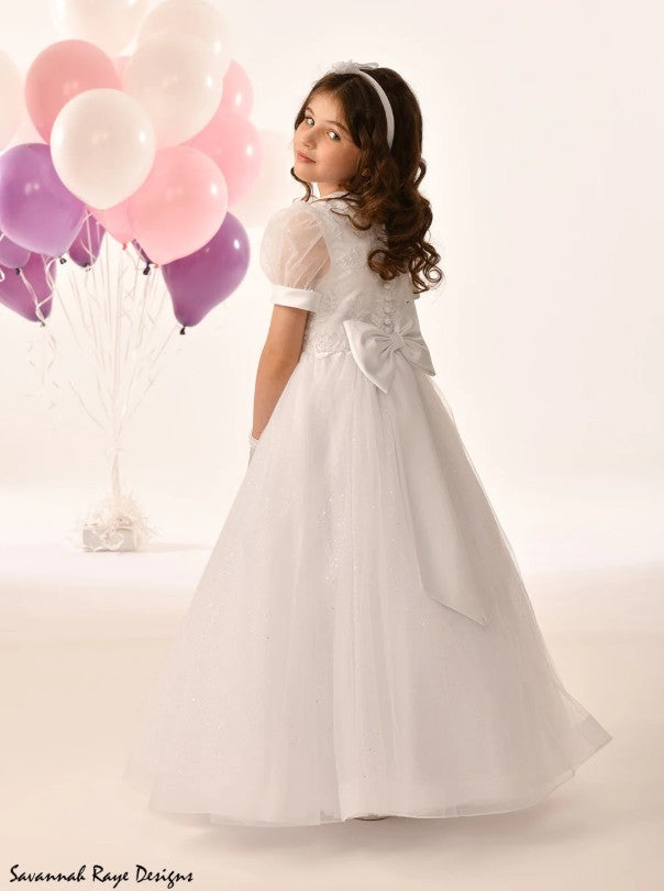 - Popular communion dress style, featuring a classic A-line silhouette with whimsical sparkle throughout