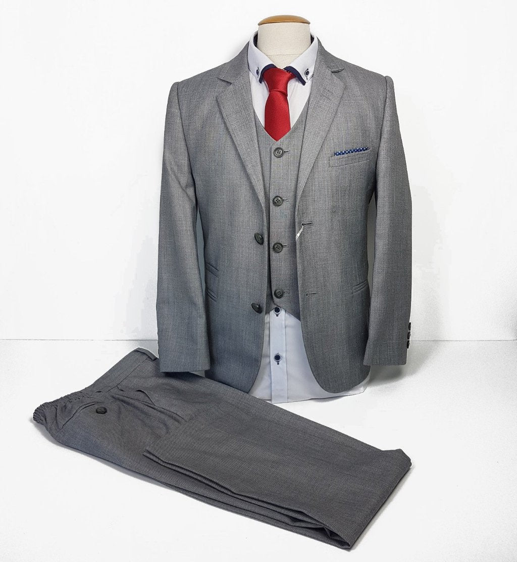 Looking for the perfect suit for his Communion day? Creon Previs suits are made with quality and style in mind. This particular 3 piece suit comes in a fashionable light grey colour with two buttons for closure on the jacket, two hip pockets, a chest pocket and two interior pockets. The pants feature a zip & button closure, an elasticated waist, belt loops, two front pockets and a back pocket with a button for safe keeping. Finally, the waistcoat has four buttons for closure, two mock pockets and offers an extra level of sophistication to this already handsome suit.