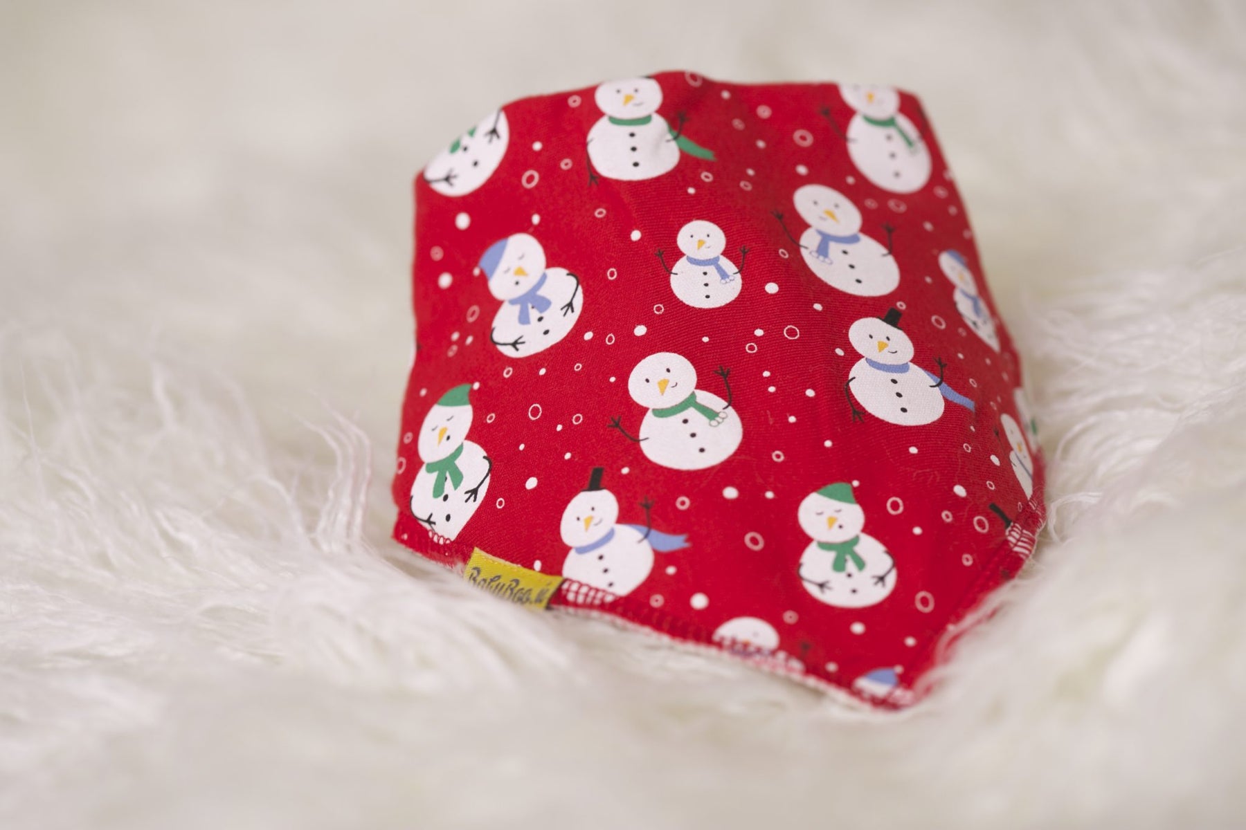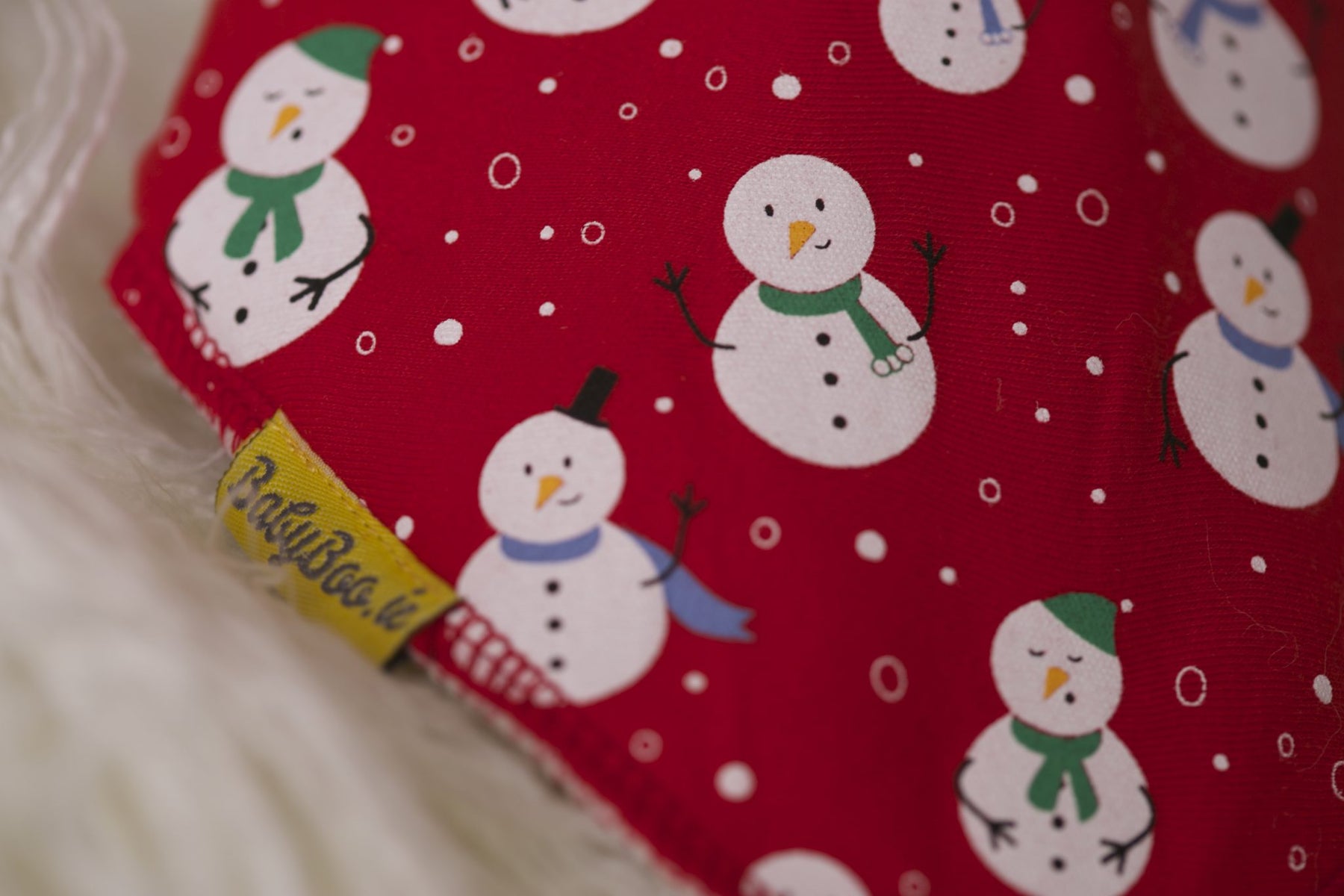 A gorgeous Christmas bandana bib for your little one. Elegantly decorated with an all-over snowman print and featuring adjustable nickel free popper buttons and double layer soft fleece backing. The cotton front extends inside the neck area to avoid any irritation to your baby's delicate skin. This Babyboo bib is cute and comfortable to wear all day long.