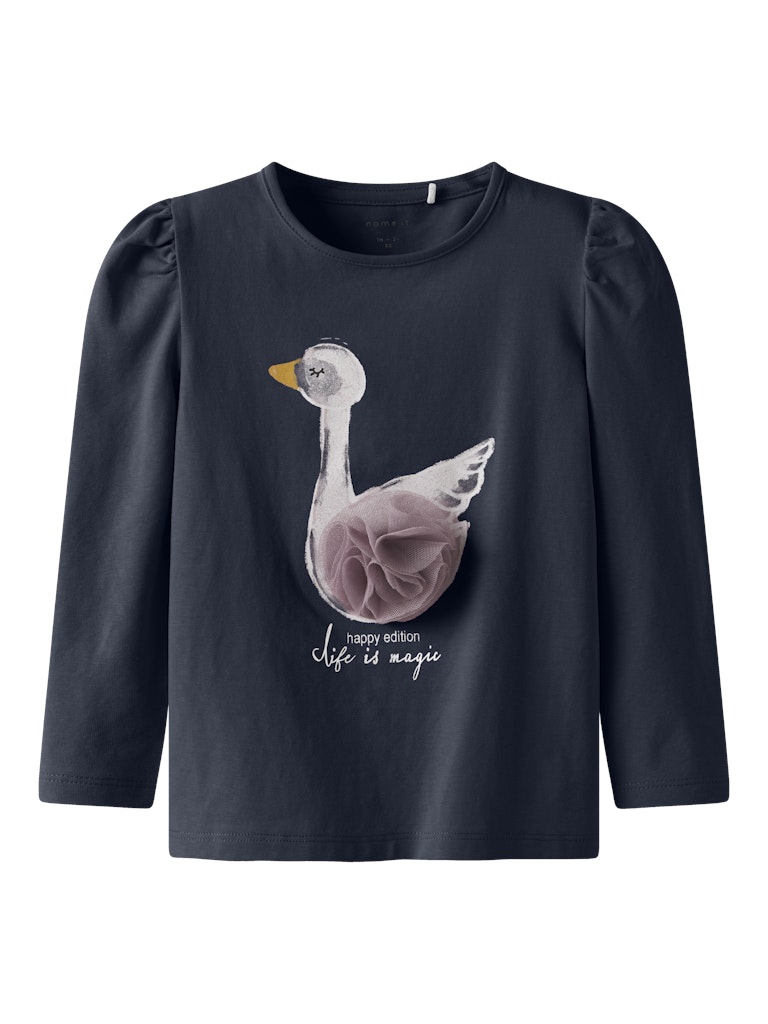 • 3D detail: Long-sleeve top in clasic navy with 3D tulle swan detail and pretty gathered shoulders