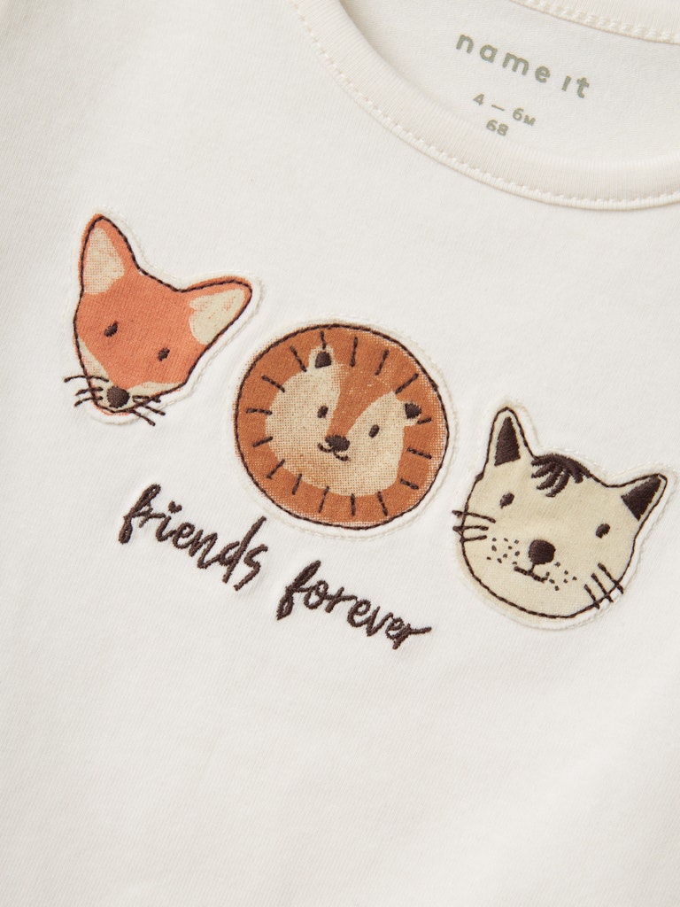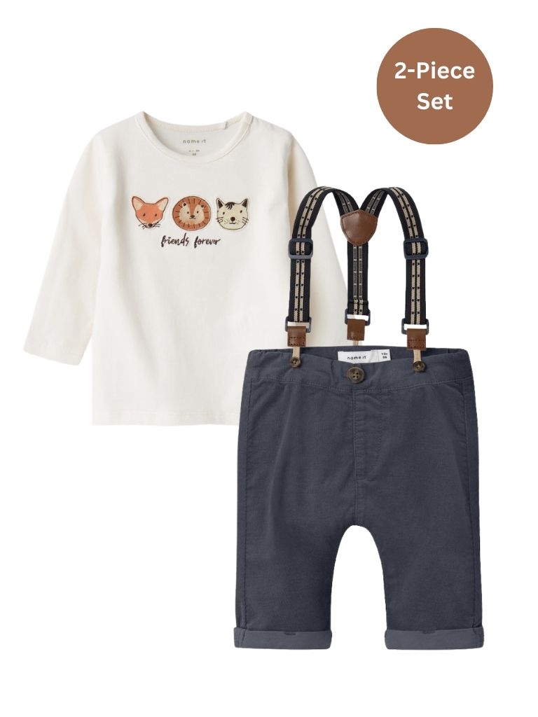 This versatile baby boy set is both adorable and practical. It is part of the Name it collection and is made of soft organic cotton, making it comfortable for your little one to wear all day long. The top features "forever friends" embroidery with 3 animal motifs and shoulder poppers for easy changing.