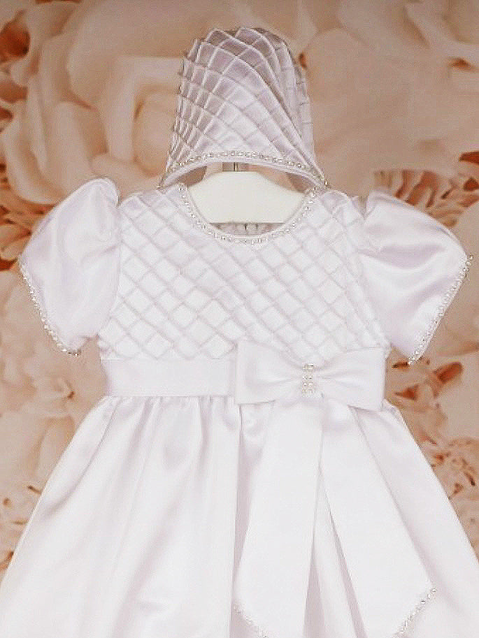 This elegant Christening gown has been beautifully designed by Sweetie Pie and hand made with expert craftsmanship. An intricate diamond-cut lattice covers the bodice, bonnet and hemline. The white satin fabric is trimmed in tiny diamante, and a beautiful sash bow adorns the front. This traditional Christening robe is sure to become a family treasure and ensure that your baby looks extra special on their Christening day or Naming Ceremony. It is complete with a fully lined matching bonnet to complete the look. A Christening gown to be admired and reused for years to come.